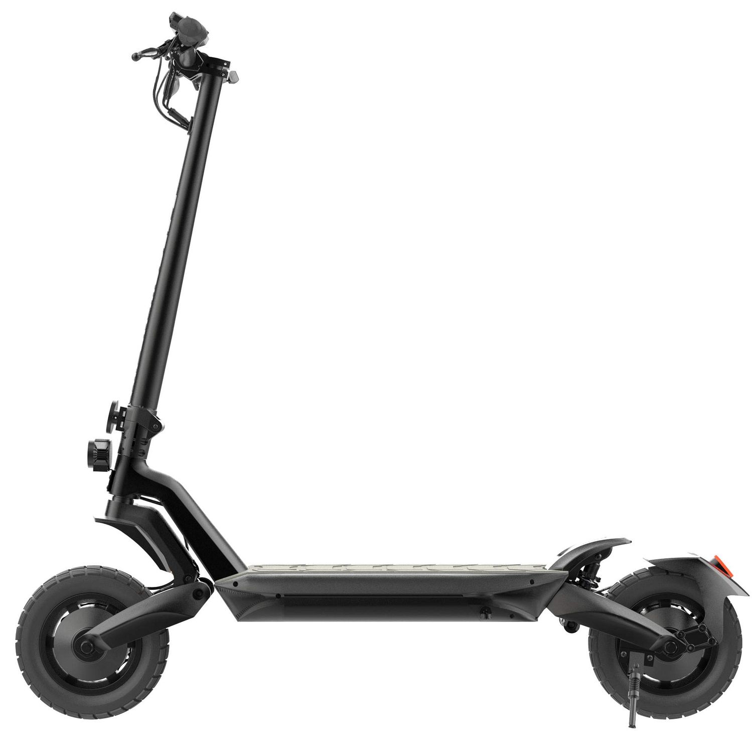 Устойчивые 10 дюймовые колёса с надувными шинами способствуют надёжному сцеплению с дорогой и мягкому ходу самоката. В передней и задней части установлены амортизаторы для максимального удобства передвижения по неровной поверхности.