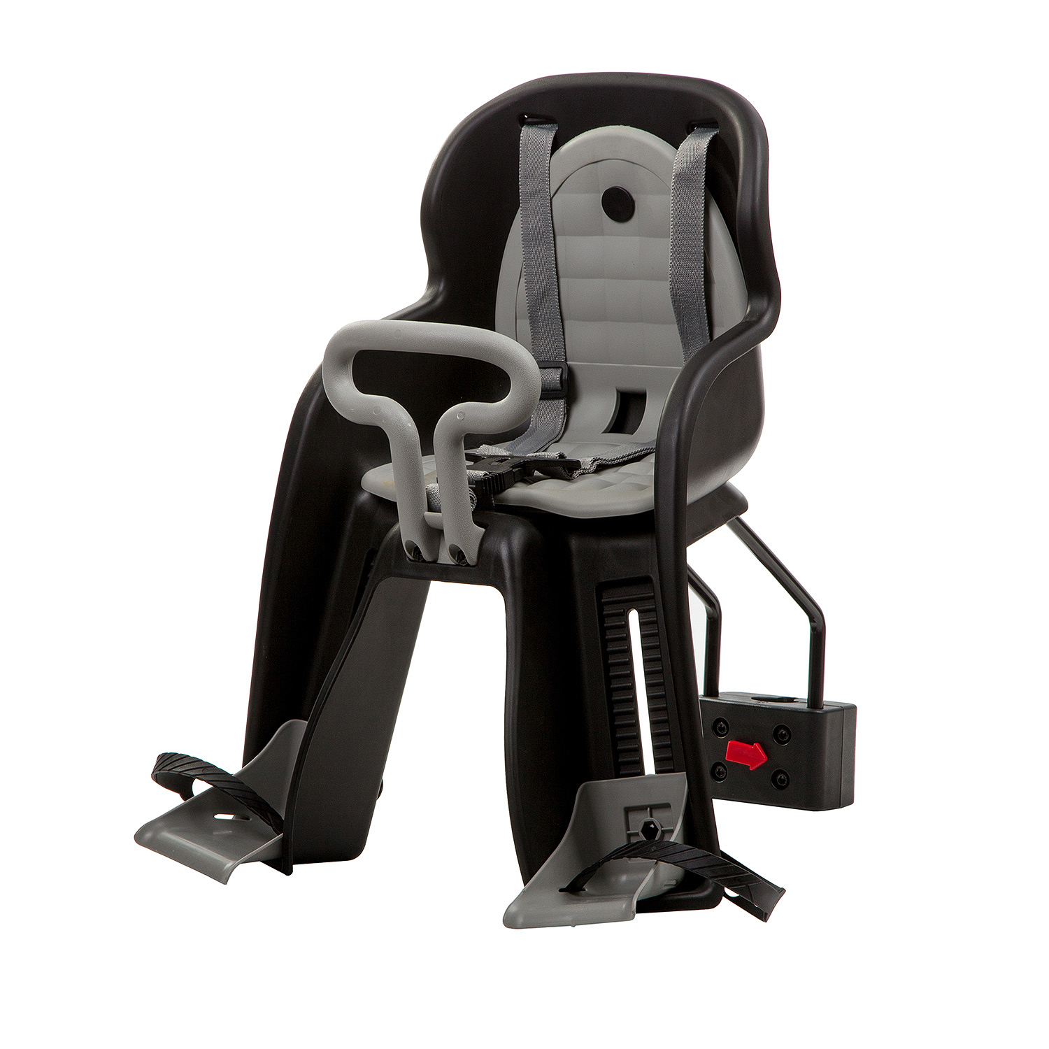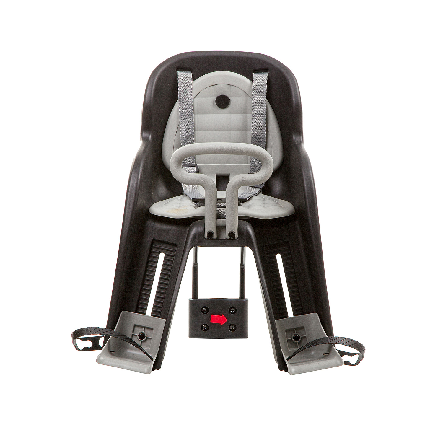 Детское кресло с креплением металлическими дугами на подседельную трубу. Оснащено 3-точечным ремнем безопасности и передней ручкой. Имеет регулировки высоты защитных подставок для ног.Максимальная нагрузка 15 кг.