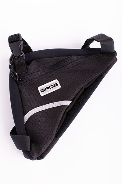 Сумка велосипедная под раму, треугольная. Основное отделение на молнии. Имеется нижнее ребро жесткости для сохранения формы сумки при загрузкеи трех точечное крепление замками–«липучками». Логотип GROS, цвет — черный.
