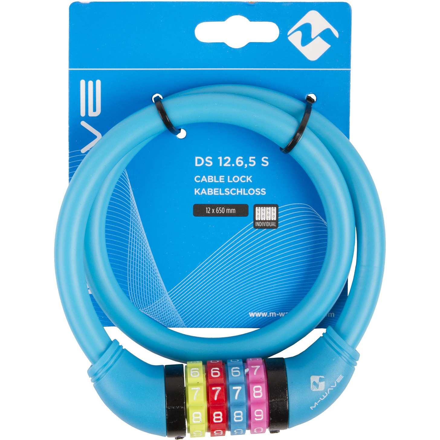 Замок M-Wave тросовый, кодовый, цветные символы, 12x650 мм, силиконовый синий, 5-231054, синий