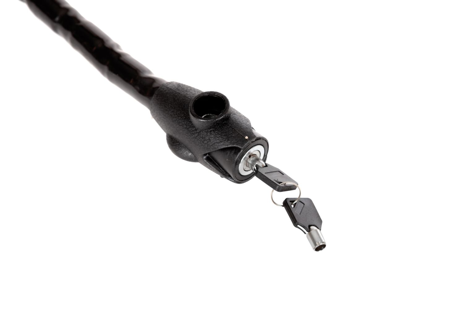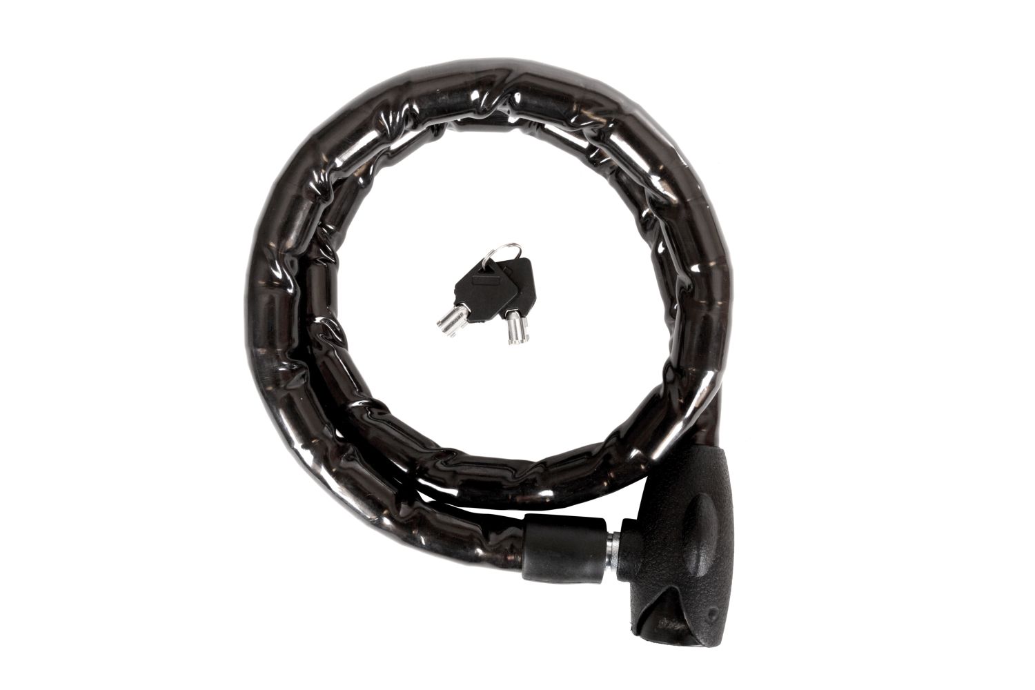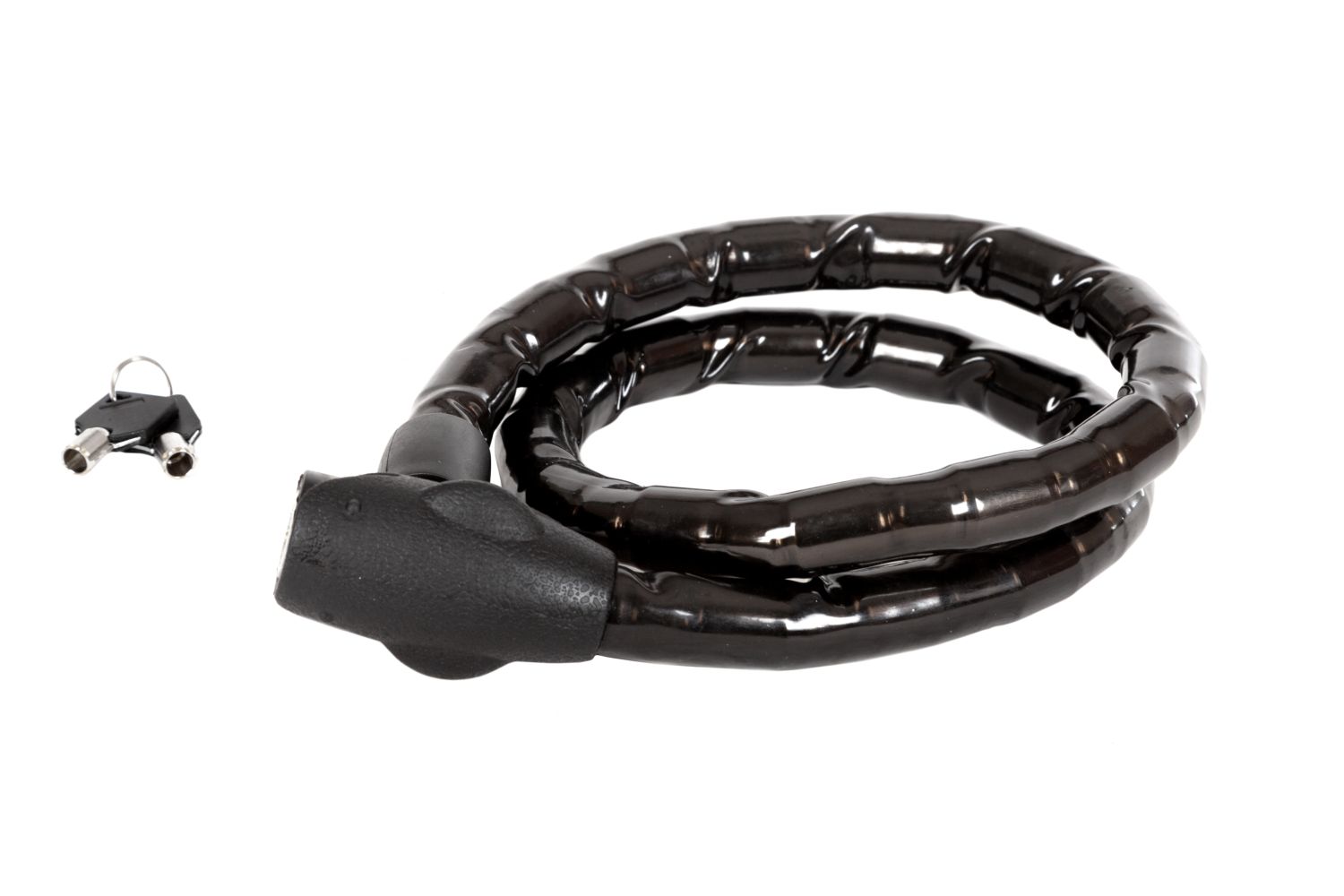 Тип замка – ключевой. Вид замка – шарнирный. Диаметр троса – 22 мм. Длина троса – 1200 мм. Материал оплетки – PVC. Кол-во ключей – 2. Тип ключа – цилиндрический. Тип упаковки – карта. Цвет – черный. Страна производства – Китай.