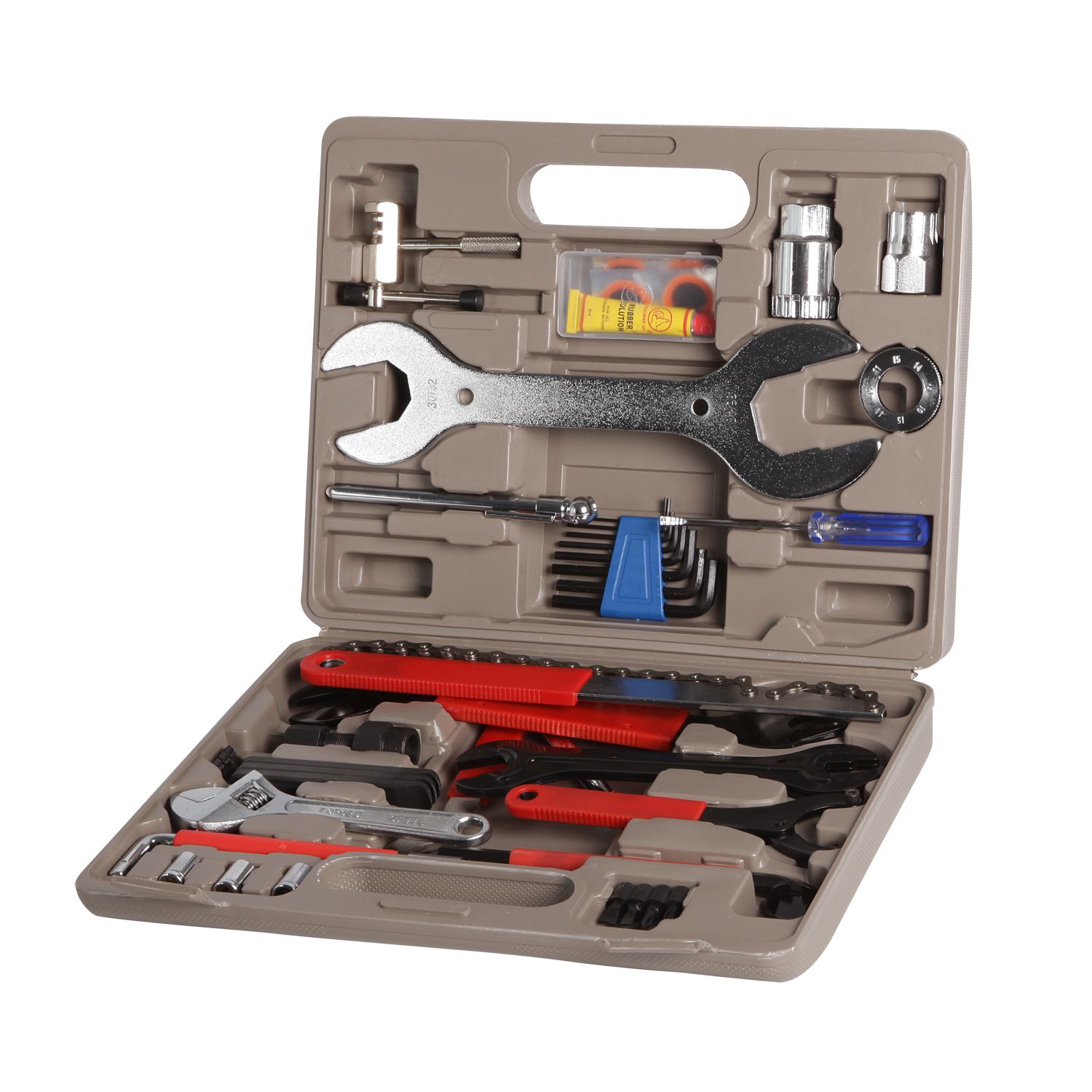 Съемник трещотки, съемник каретки, велоаптечка (металическая шкурка, клей, резиновый ниппель, 5 заплаток), выжимка цепи, спицевой ключ, ключ рулевой колонки 36мм-40мм, 30мм-32мм, отвертка - плоская, шестиграннники - 1,5мм, 2мм, 2,5мм, 3мм, 4мм, 5мм, 5,5мм, 6мм, манометр (механический), хлыст, педальный ключ (универсальный) 2х15мм,16мм,17мм, конусные ключи (2шт.) 13мм, 14мм, 15мм, 16мм, съемник шатунов, рожковый ключ 8мм, 10мм, ключ контргайки каретки 2шт, шестигранник 8мм, адаптор 10мм, монтажки платскиковые 3шт., разводной ключ, насадки: плоские 5мм, 7мм, крестовые: PH1, PH2, ключ для насадок, насадки накидных ключей: 8мм, 9мм,10мм