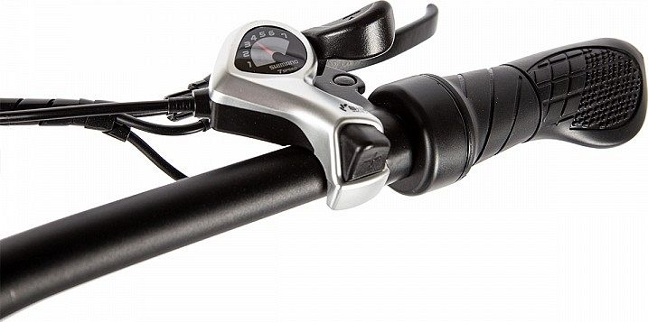 Электробайк оснащён штатным велокомпьютером с LCD-дисплеем, также модель имеет 7-скоростной привод с переключателем Shimano Tourney и дисковую механическую систему тормозов. В комплекте идут полноразмерные стальные крылья, металлический задний багажник и передняя светодиодная фара, питаемая от аккумулятора. Максимальная грузоподъемность модели составляет 110 кг.