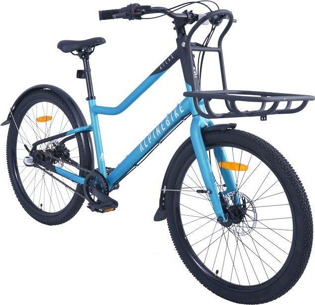 Рама Alpinebike Atlas Alloy выполнена из алюминия и отличается геометрией нового формата, которая позволяет эффективно распределять нагрузку. Велосипед оснащён колёсами на двойных ободах: 24 дюйма спереди и 26 дюймов сзади, что придаёт ему отличную манёвренность и устойчивость на дороге. Большой передний багажник добавляет функциональности, позволяя перевозить значительное количество груза.