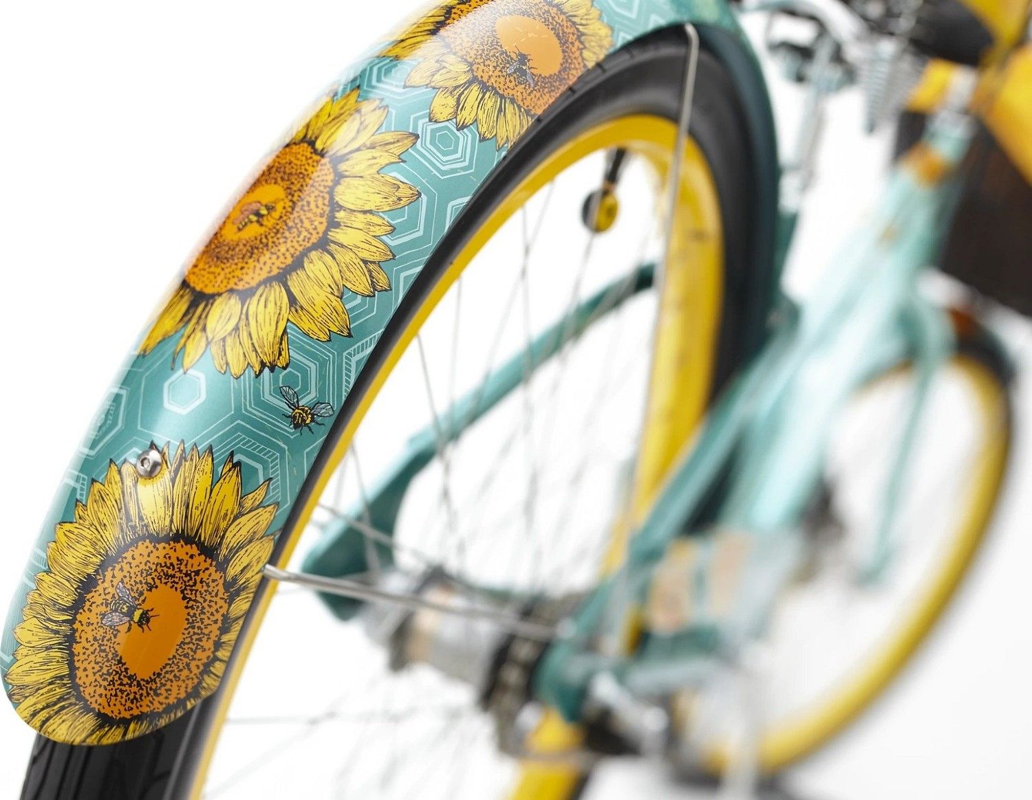 Градиентная окраска рамы, украшенная яркими подсолнухами, создает ощущение тепла и радости. Принт в виде сот, по которым перемещаются пчелы, поддерживает общий ритм и стилистику модели, создавая приятное ощущение гармонии жизни. Смелые желтые диски, кастомное седло и стилизованные грипсы дополняют красоту и уникальность этого велосипеда.
