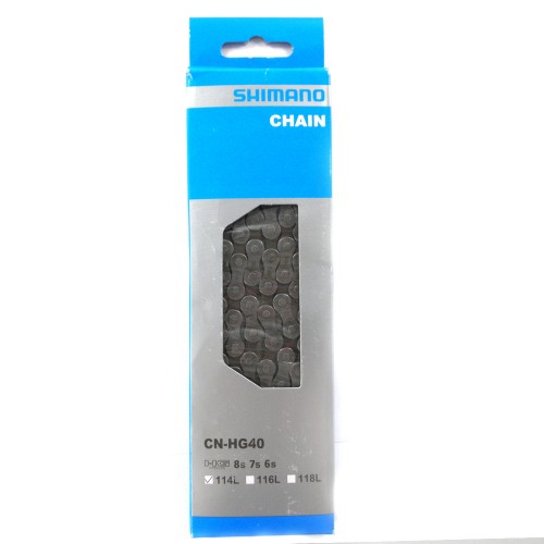 HG40 - надежная цепь, разработанная японской компанией Shimano специально для велосипедов любительского уровня с навесным оборудованием Altus и Alivio. Подойдет для 6/7/8-скоростных трансмиссий. Цепь состоит 115 звеньев, ее ширина составляет 7,3 мм. Для быстрой установки в комплекте имеется специальный замок UG51. Весит цепь 335 граммов.