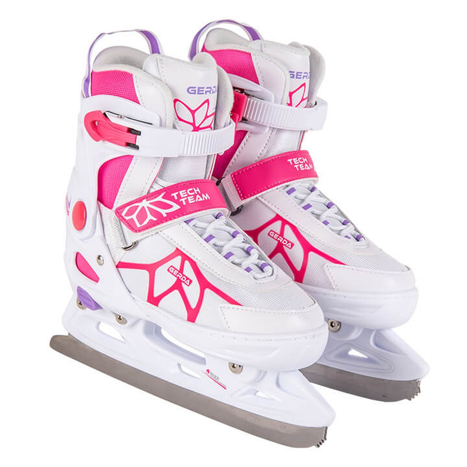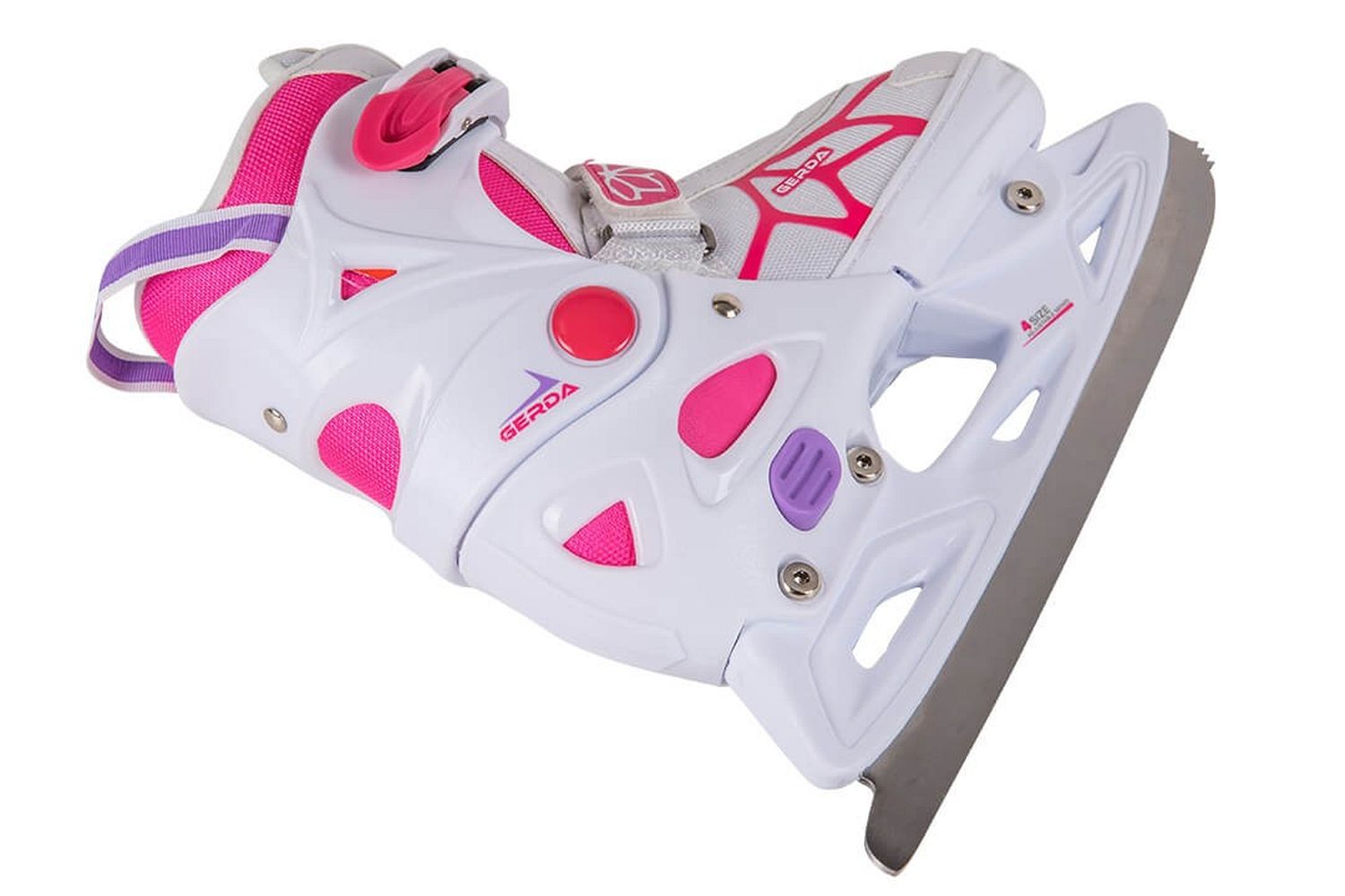 Красивые и практичные коньки для девочек с системой регулировки размера. Ботинок специальной конструкции позволяет увеличить размер в пределах 2-2,5 см, что позволяет адаптировать его к постоянно растущей ноге ребенка и комфортно кататься не один сезон.