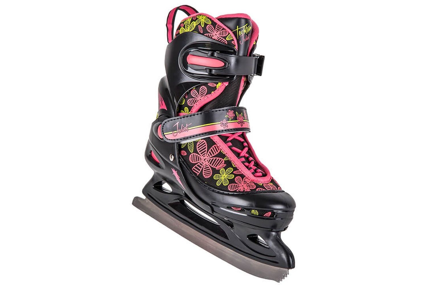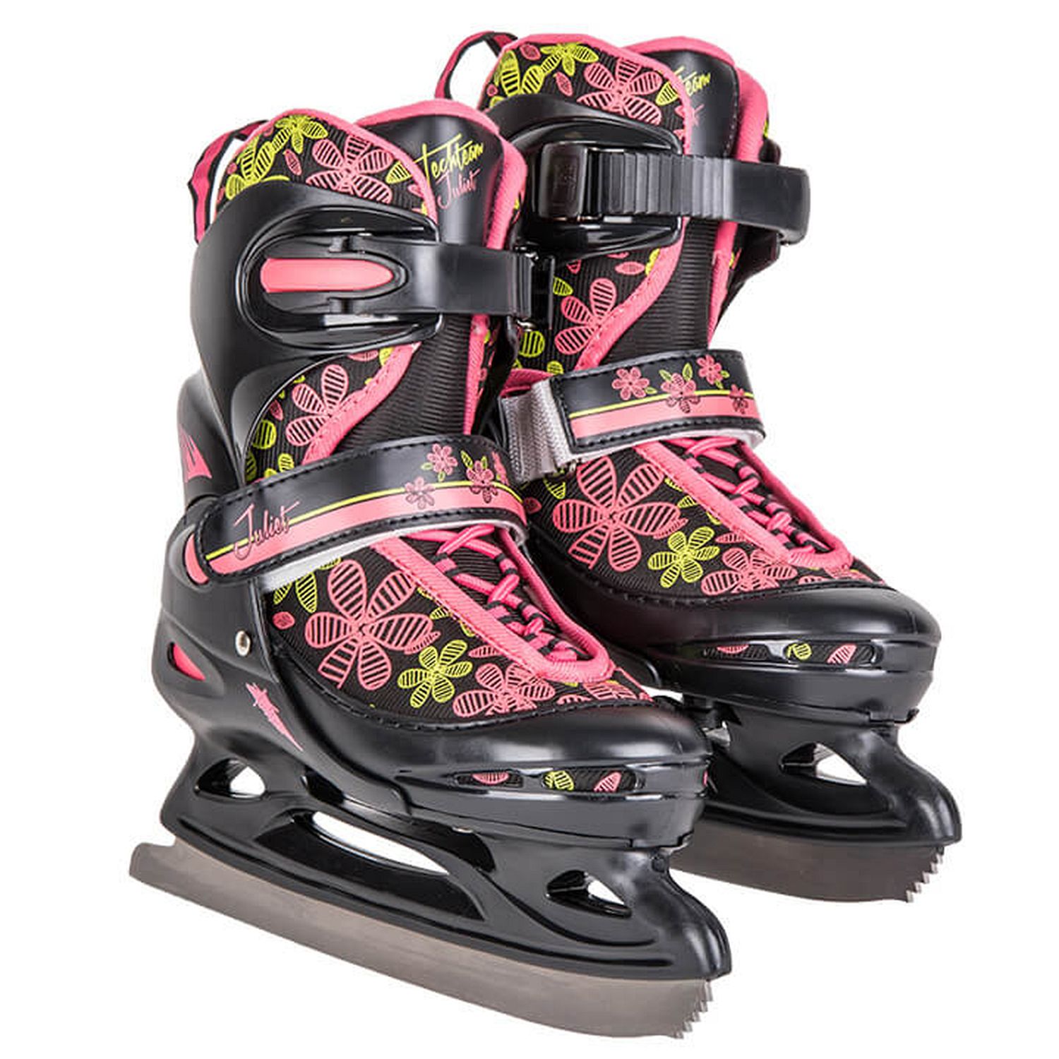 Коньки Juliet – эти коньки для самых утонченных модниц! Прекрасный дизайн и расцветка не оставят без внимания ни одну девочку. А характеристики, вместе с универсальным раздвижным механизмом будут, несомненно, одним из плюсов этих коньков. Ведь каждый родитель хочет, чтобы коньки эксплуатировались не только один сезон. Каркас ботинка состоит из пластика, что позволит лучше чувствовать коньки при маневрировании. Уникальное лезвие из нержавеющей стали не поддастся коррозии и сохранит свои первоначальные свойства. Девочку легко обучить одевать и снимать ботинок, ведь механизм клипсы и липучки очень прост.