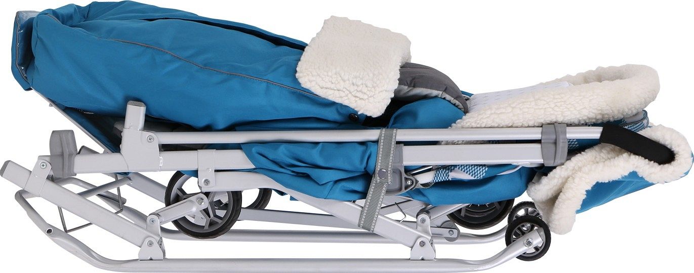 Габаритные размеры санок-коляски в разложенном виде составляют 1050х445х1030 мм, а в сложенном виде – 1070х455х280 мм. Вес изделия составляет 10,5 кг.