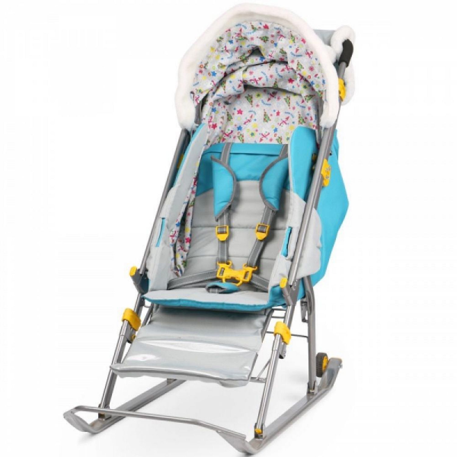 Санки имеют прочные и легкий каркас, чехол выполненный из высококачественного влагоотталкивающего материала. Спинка регулируется до положения лежа, складной козырек со смотровым окошком опускается до ножек ребенка, создавая комфортную атмосферу для отдыха. Модель имеет перекидную ручку и небольшие транспортировочные колеса на задней части полозьев. Санки оснащены пятиточечными ремнями безопасности и мягким и теплым чехлом для ножек. Родителей, несомненно, порадует удобная, вместительная сумка и теплая муфта на ручке. Модель легко складывается, занимает мало места при транспортировке. Прекрасный вариант для холодной и снежной зимы!